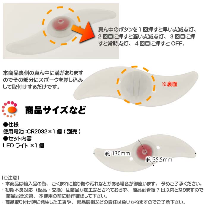 商品名 自転車スポーク部分に取付け LEDライト 商品説明 防滴仕様の自転車スポーク部分に取付けするLEDライトです。
